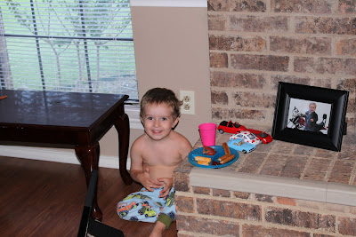 (this is where he chose to eat. I don't know why. And he had asked to put his jammie pants back on. Again, I don't know why.)